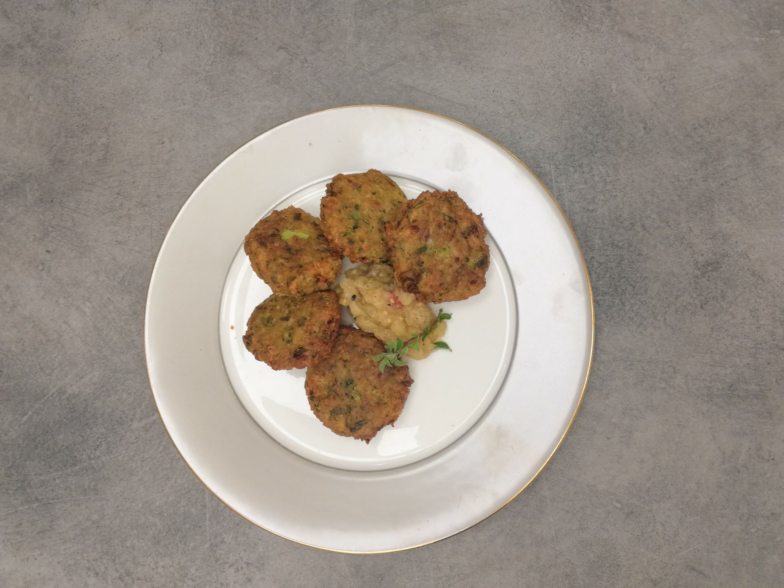 Ios chickpea meatballs with garnish of Mount Athos eggplant salad